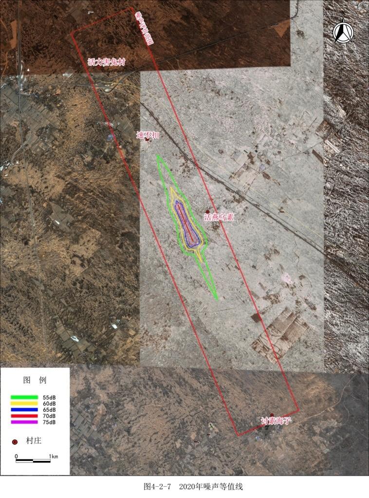 圖1 北京新機場噪聲評價范圍圖 (2)案例二:神木通用機場工程[4] 陜西神木通用機場,不屬于運輸機場,其主要功能為農(nóng)用及救援等,該類機場一般具有跑道短,飛行活動不定期,單機源強較小的特點。該項目建設(shè)目標(biāo)年起降量為1860架次(日均起降5架次),跑道1800米,按照最低限兩端6公里,兩側(cè)1公里劃定評價范圍。根據(jù)噪聲預(yù)測結(jié)果,70dB等值線位于跑道兩端200米,兩側(cè)200米以內(nèi),神木機場噪聲評價范圍見圖2(為顯示噪聲影響范圍趨勢,項目將等值線繪制到了55dB)。